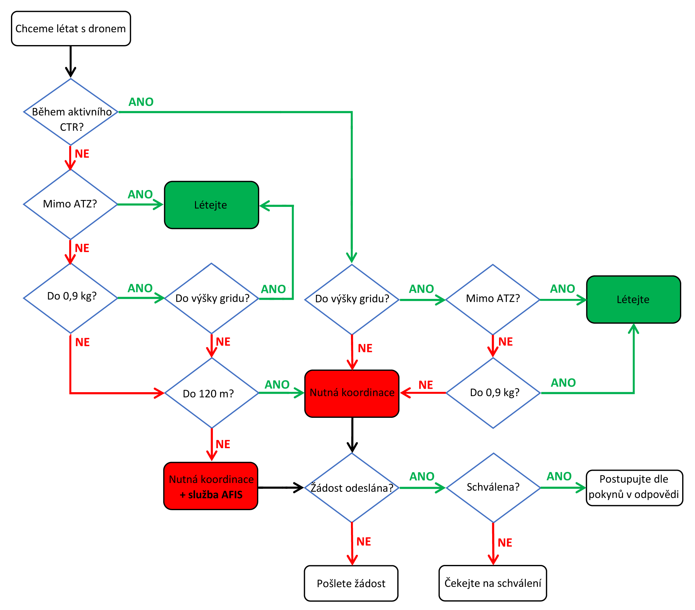 Výcvikové letyNutnost koordinovat lety bezpilotních letadel (dronů) v CTR nebo ATZ závisí na jejich zeměpisné poloze, maximální výšce a hmotnosti.