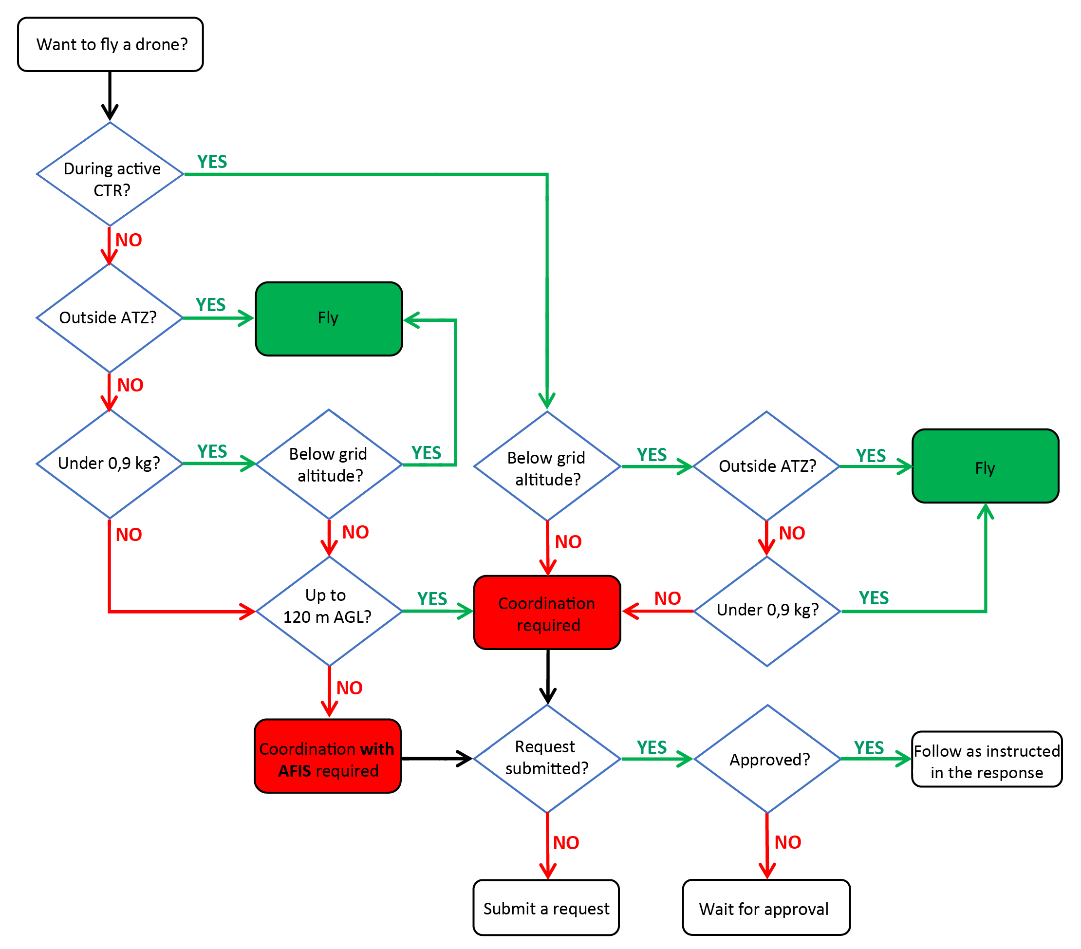 The requirement to coordinate unmanned aircraft (drone) operations within a CTR or ATZ depends on their geographic location, maximum altitude, and weight.